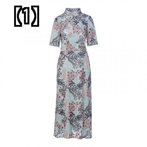 チャイナドレス ロング おしゃれ 花柄 ボタニカル 半袖 膝丈 レディース 春夏 大きいサイズ 上品 華やか 大人 ワンピース グレー 黄色